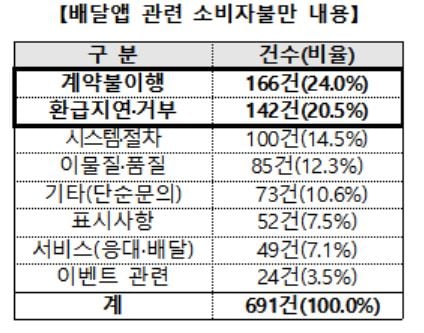 26일 소비자원에 따르면 최근 3년8개월간 ‘1372 소비자상담센터’에 접수된 배달앱 관련 불만은 총 691건이었다. 불만 내용은 미배달·오배달 등 ‘계약불이행’ 관련 불만이 166건(24%)으로 가장 많았다. 이어 ‘환급지연·거부’ 관련 불만이 142건(20.5%), ‘전산시스템 오류, 취소 절차 등’의 불만이 100건(14.5%)으로 뒤를 이었다.