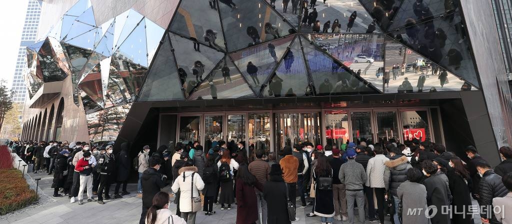 2일 오전 9시 경기도 수원 갤러리아백화점 광교점 앞에 수십명의 사람들이 줄을 서 있자, 길을 지나가던 시민들이 물었다. 백화점 그랜드 오프닝(개장) 시간인 오전 10시30분이 되자 사람들은 더 몰려 건물을 빙 둘러 수백미터 줄을 섰다.