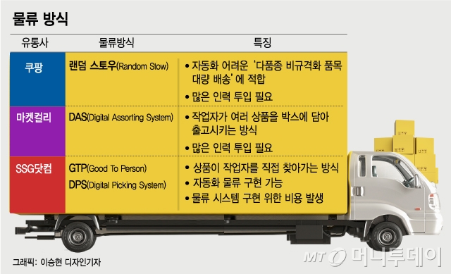SSG닷컴이 채택한 방식은 상품이 작업자를 자동으로 찾아오는 GTP(Good To Person) 시스템과 자동 재고관리 시스템, 구매 빈도가 높은 상품 선별에 최적화된 DPS(Digital Picking System) 등이다.
