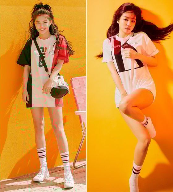 두 사람은 티셔츠를 미니 원피스처럼 연출하고, 발목 위로 올라오는 라인 블로킹 디테일의 스포츠 양말을 매치해 귀엽고 발랄한 분위기를 연출했다.