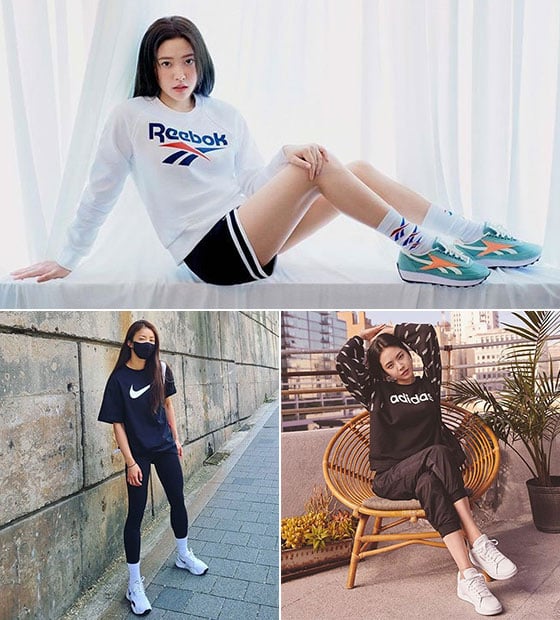 그룹 레드벨벳 예리, 배우 이시영, 그룹 에이핑크 손나은은 스포츠 브랜드의 로고가 전면에 큼직하게 새겨진 티셔츠와 다양한 아이템을 매치해 멋스러운 애슬레저 룩을 완성했다.