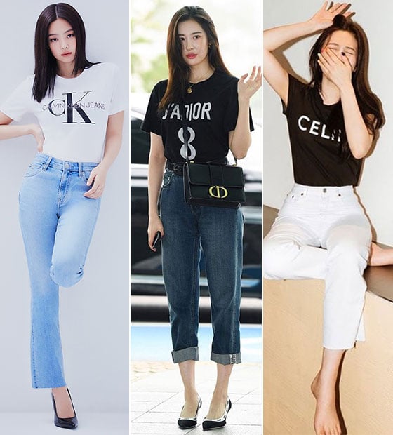 그룹 블랙핑크 제니처럼 시원한 색감의 청바지와 로고 티셔츠를 매치하고, 앞코가 뾰족한 하이힐을 신으면 다리가 더 길어보일 수 있다.