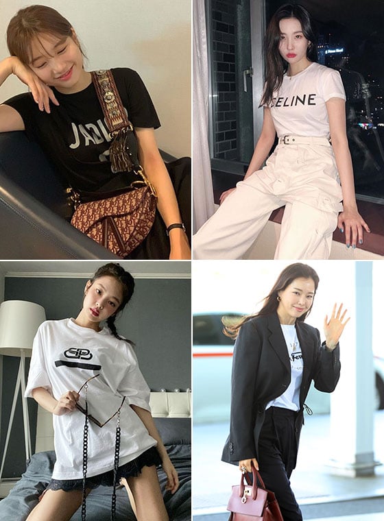 브랜드 로고만으로도 충분히 포인트가 되는 로고 티셔츠, 스타들은깔끔한 무채색 티셔츠로 시크한 패션을 연출했다. 컬러는 단조롭게 연출하는 대신 브랜드 로고로 포인트를 준 셈이다.