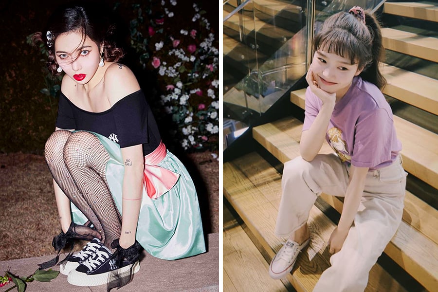 가수 현아는 컬러풀한 니트 베스트와 청반바지 차림에 흰색 스니커즈 뮬을 신었다. 발목이 시원하게 드러나 종아리가 더욱 길어 보인다.