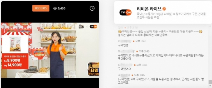 지난 21일 오후 3시 티몬 라이브커머스 채널인 '티비온'에서는 중소기업벤처부가 운영하는 온라인 쇼핑몰 '가치삽시다'와 협업한 국내산 누룽지와 구운란 판매 방송이 진행됐다. 7000여명이 동시에 방송을 시청하면서 "누룽지를 젓갈이나 김치랑 먹어보라, 해장할때도 좋다 맛있겠다" 등의 댓글을 남겼다. 방송 중 구매하거나 구매 인증 댓글을 남기면 20% 할인쿠폰과 +1 행사 등이 진행돼 방송 막바지로 갈수록 "구매했다"는 댓글도 줄줄이 달렸다.