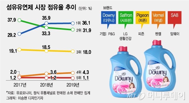 P&G의 기존 다우니 전제품에는 향기를 캡슐로 감싸 향이 오래 지속되는 '향기캡슐'이 들어있었다. 강한 향을 앞세운 다우니는 2018년 국내 섬유유연제 시장에서 LG생활건강을 제치고 점유율 1위로 올라섰다.