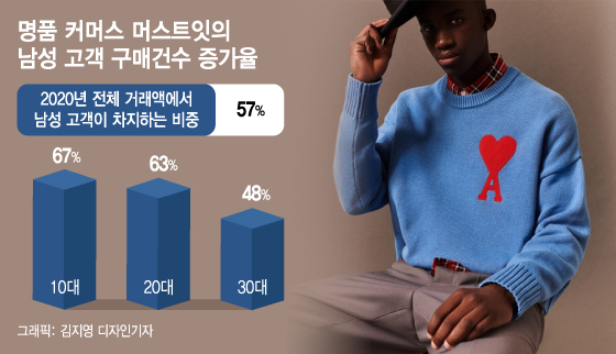 명품 온라인 플랫폼 머스트잇의 2020년 구매 데이터에 따르면 지난해 전체 거래액에서 남성 고객이 차지하는 비중이 무려 57%로 여성 고객 비중을 앞질렀다. 연령대별로는 10대부터 30대 고객의 명품 구매 건수가 크게 늘었는데, 구매 건수 증가율은 20대와 30대가 각각 63%와 48%를 기록했고 10대의 증가율이 67%로 가장 높았다.