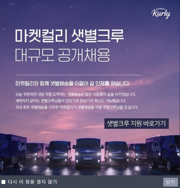 31일 관련 업계에 따르면 마켓컬리는 오는 9월10일까지 샛별배송 차량 운전·배송 업무를 수행할 '샛별크루'를 세 자릿수 공개채용을 진행한다.