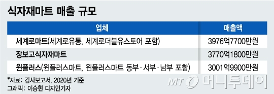 국내 최대 식자재마트 세계로마트는 지난해 3977억원 매출액을 기록하며 사상 최대치를 기록했다. 2019년 매출(3328억원) 대비 약 20% 늘었다. 국내 최대 식자재마트 중 하나인 장보고식자재마트 역시 2019년 매출 3164억원에서 지난해 3770억원으로 약 17% 성장했다. 몸집도 꾸준히 키웠다. 최승재 국민의힘 의원이 한국유통학회에 받은 자료에 따르면 전국의 식자재마트 점포 수는 최근 5년(2014~19년) 간 74% 증가했다. 전체 시장규모는 약 9조7000억원으로 추산된다.