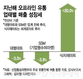 14일 관련 업계와 산업통상자원부의 주요 유통업체 매출 동향 자료 등에 따르면 지난해 오프라인 유통시장에서 대형마트와 SSM 매출은 감소한 반면 대형 식자재마트는 사상 최대 매출을 기록했다. 대형마트와 SSM은 유통산업발전법에 따른 규제에 더해 코로나19(COVID-19)에 따른 외출 자제, 다중이용시설 기피까지 겹치며 각각 전년비 3.0%, 3.8% 매출이 줄었다. 유통산업발전법은 전통시장 반경 1㎞ 이내를 보호구역으로 정해 3000㎡ 규모 이상의 대형마트와 대기업이 운영하는 상점은 추가 출점할 수 없도록 하고, 이미 있는 점포는 '월 2회 휴무'와 '자정부터 오전 10시까지 영업금지' 등의 규제를 받도록 하고 있다.