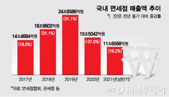 국내 면세업계는 반색하는 분위기다. 구매한도 폐지가 코로나19(COVID-19) 타격으로 고사 상태에 이른 면세업계에 '가뭄의 단비'가 될 수 있어서다. 지난해 국내 면세점 매출은 전년인 2019년(24조8586억원) 대비 반토막 난 15조5042억원을 나타냈다.