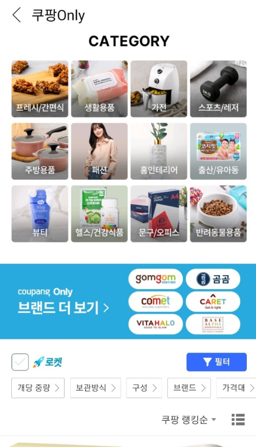 쿠팡은 2019년 생수인 '탐사수'로 PB제품을 처음 론칭한 이후 다양한 카테고리로 제품군을 늘려 왔다. 현재 판매하고 있는 PB브랜드는 신선식품 중심의 '곰곰', 생활용품 '코멧' '탐사' 생활가전 '홈플래닛' 뷰티 '비타할로' 유아용품 '비지엔젤' 등 14개다. 쿠팡 애플리케이션에는 PB제품들로만 구성된 '쿠팡 ONLY' 코너도 있다.