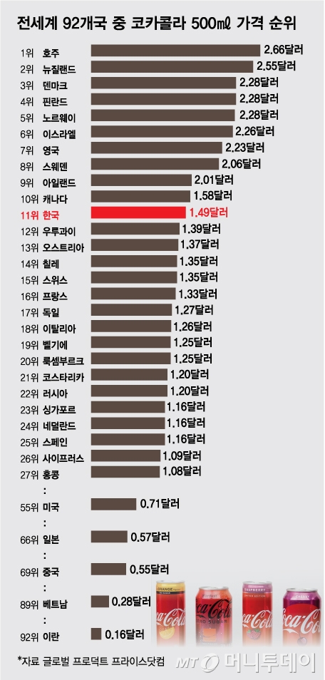 코카콜라 500㎖ 가격, 한국이 92개국 중 11번째로 비싸… 일본은 66위, 미국은 55위