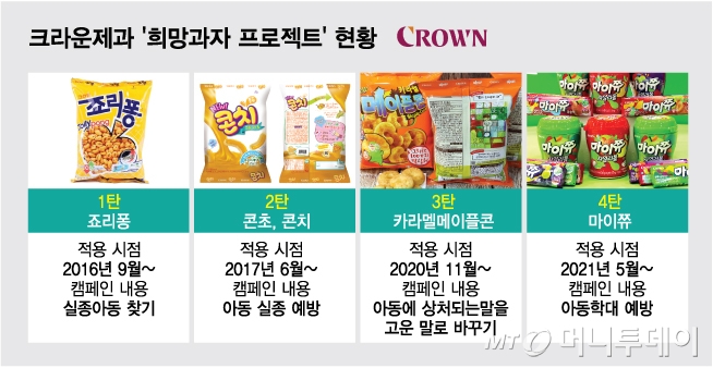 크라운제과는 2016년 조리퐁에 적용해온 실종아동찾기 '희망과자 프로젝트' 대상 품목을 점차 늘려가고 있다. 2017년 6월부터는 어린이 선호도가 높은 스낵 '콘초'와 '콘치' 포장지에 미아방지와 유괴예방 수칙을 적었고, 2020년 11월엔 국제 아동구호 단체 '세이브 더 칠드런'과 함께 '그리다, 말 상처 캠페인'을 전개하며 '카라멜 메이플콘' 포장지에 아이들에 상처가 되는 말을 고운 말로 바꿔 싣는 방식을 소개하기 시작했다. 지난해 5월부터는 '마이쮸' 포장지에 아동학대 신고 번호인 '아이지킴콜 112'를 인쇄하고 있다.