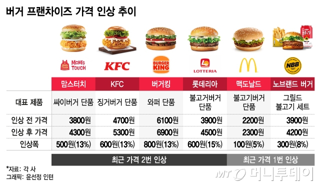 한편 맥도날드와 노브랜드 버거는 아직 추가적인 가격 인상 대열에 합류하지 않았다. 맥도날드는 지난 2월 평균 2.8% 가격 인상, 노브랜드 버거는 지난해 12월 평균 2.8% 가격 인상을 단행했다. 노브랜드 버거는 가격 인상에 대해 계획이 없다고 했지만 맥도날드 관계자는 "검토 중"이라고 했다.
