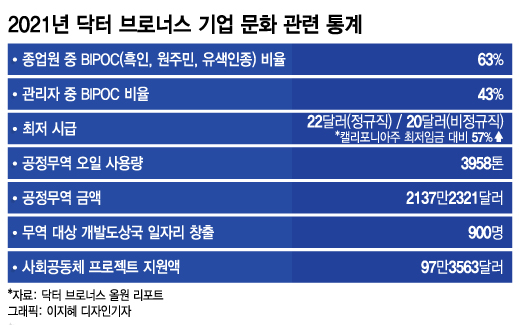 닥터 브로너스 직원 중 63%는 BIPOC(black, indigenous and people of colour, 백인이 아닌 흑인, 원주민, 유색인종)다. 특히 관리자 직급에서도 43%가 BIPOC다.