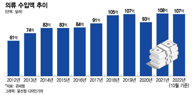 이런 추세는 수입 의류에서 두드러진다. 의류 수입액은 사상 최대를 향해 달려가고 있다. 관세청에 따르면 올해 우리나라 의류 수입액은 10월 말까지 누적 107억달러다. 달러 강세에도 지난해 연간 수입액(108억달러)에 근접했다. 의류 수입액은 2018년 100억달러를 처음 돌파한 뒤 코로나19 여파에 2020년 93억달러로 움츠러들었다가 지난해 다시 100억달러를 재돌파했다. 110억 달러 신기록도 멀지 않았다. 2012년 수입액이 61억달러였던 점을 감안하면 10년간 약 2배가 늘어난 셈이다.