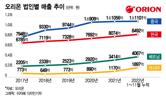 19일 식품업계에 따르면 지난해 11월까지 오리온 연결기준 매출액은 2조5557억원으로 이미 2021년 연간 매출 2조3555억원을 넘어섰다. 주요법인별로 보면 중국 1조1101억원, 국내 8492억원, 베트남 4067억원, 러시아 1765억원 등이다.