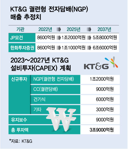 이런 이유로 국내외 주요 증권사들은 15년 후 KT&G의 관련 매출이 7~8배 늘어날 것으로 예측한다. 최근 PMI와 전자담배 장기계약이 확정됨에 따라 계약이 종료되는 2037년 NGP 매출을 JP모건은 5조8000억원, 한화투자증권은 6조6000억원으로 각각 전망하는 보고서를 냈다. 이들 보고서를 통해 KT&G는 연평균 NGP 매출액을 20.6%, 매출수량을 24.0%로 급성장할 것으로 내다봤다. 지난해 KT&G의 NGP 매출은 국내외 포함 약 8700억원 규모다.