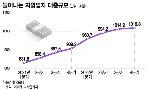 자영업자의 빚내서 빚갚는 이른바 '빚 돌려막기'는 한계에 이르렀다는 분석이다. 한국은행의 '자영업자 대출현황'을 보면 지난해말 자영업자 대출잔액은 1020조원으로 처음으로 1000조원을 돌파했다. 대출자의 56.4%인 173만명이 3개 이상의 대출을 받은 다중채무자로 대출잔액의 70.6%(720조3000억원)를 차지한다. 기준금리가 2021년 8월 0.5%에서 현재 3.5%로 오르면서 다중채무자의 이자 부담은 연평균 908만원이 늘어났다.