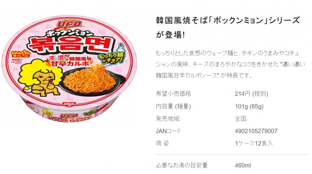 이 제품들은 삼양식품이 2018년 선보인 '까르보불닭볶음면'과 유사하다. 삼양식품의 까르보불닭면은 매운 소스에 치즈를 더해 부드러운 맛을 내 외국인들에게 인기가 높다. 닛신식품은 라면 포장지 색상부터 까르보불닭면과 유사한 연한 분홍색을 적용했다. 포장지에 한글 '볶음면'이란 표기를 했고, 맛도 한국풍이라는 점을 강조했다.