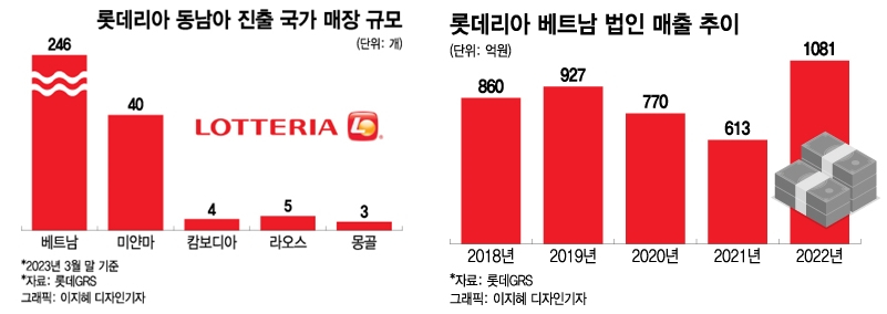 베트남 판매량도 대폭 늘어났다. 롯데GRS에 따르면 지난해 롯데리아 베트남 법인 매출은 1081억원으로 현지 진출 24년 만에 처음으로 연매출 1000억원을 넘어섰다. 코로나19 확산 이전엔 연매출 927억원이었다가 2020년 770억원, 2021년 613억원으로 하락했지만 지난해 전년 대비 76%의 매출 신장률을 기록하며 최고 매출 성과를 냈다.