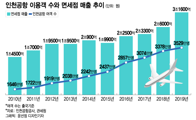 2010년 165만명 수준이던 인천공항 출국자수는 2019년 353만명으로 약 114% 늘었다. 같은 기간 면세점 매출은 1조4500억원에서 3조1600억원으로 약 118% 증가했다.