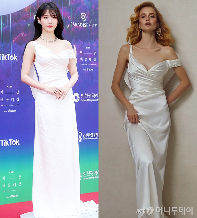 이날 아이유가 입은 의상은 웨딩드레스 브랜드 '캐서린 타시'(Katherine Tash)의 제품이다.