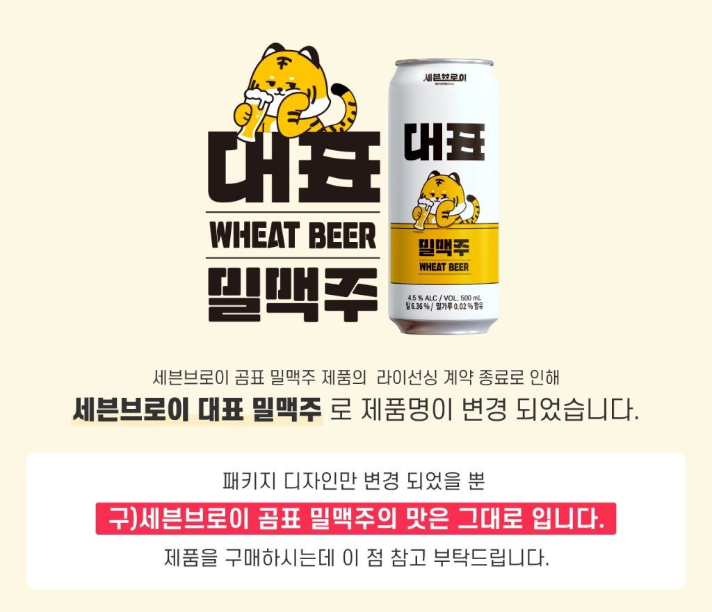 앞서 세븐브로이는 곰표밀맥주의 상표권자인 대한제분과 계약이 끝난 뒤 곰표밀맥주의 맛은 유지하되 이름을 대표밀맥주로 바꿔 4월 새로 출시했다.