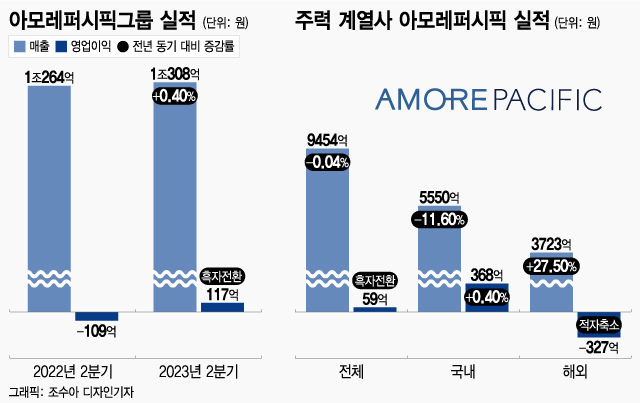 주력 게열사인 아모레퍼시픽의 국내 사업 부문은 면세 매출 부진의 여파로 전년 동기 대비 11.6% 줄어든 5550억원의 매출을 기록했다. 멀티브랜드숍 채널에서는 성장세가 이어졌으나 면세 채널이 두 자릿수 가량 매출이 하락하며 부진했다. e커머스 채널 역시 매출이 줄었다. 다만 데일리 뷰티 부문이 e커머스 채널에서 매출이 늘어나며 국내 사업 부문 영업이익 개선에 영향을 미쳤다.