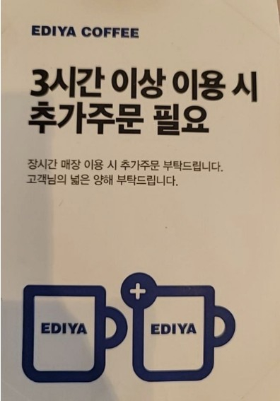 23일 뉴시스에 따르면 일부 이디야 매장은 '3시간 이상 이용 시 추가 주문 필요'라는 내용을 공지, 이용 시간을 제한하고 있다. 최근 음료 1잔만 주문하고 오랜 시간 자리를 차지하고 있는 카공족들이 늘면서 시작된 조치다.