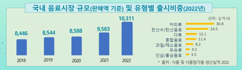 2일 식품산업통계정보 보고서에 따르면 2022년 국내 음료시장 규모는 10조3115억원으로 전년대비 7.6% 증가했다.