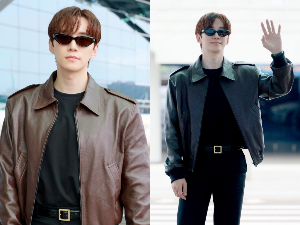 이날 이준호는 시크한 블랙 스타일에 브라운 가죽 자켓과 젠틀몬스터 선글라스를 착용해 완벽한 공항패션을 선보였다.