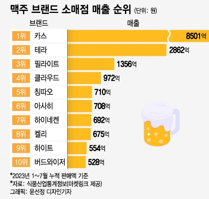 브랜드별 판매액은 카스가 8501억원으로 가장 많았고 이어 테라(2862억원) 필라이트(1356억원) 클라우드(972억원) 칭따오(710억원) 아사히(708억원) 하이네켄(692억원) 켈리(675억원) 하이트(554억원) 버드와이저(528억원) 순으로 집계됐다. 이들 10대 브랜드 외에는 모두 기타 브랜드 매출로 분류된다.