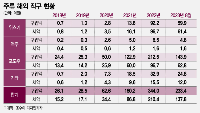 해외에서 술을 직구한 금액이 4년 사이 13배 가까이로 급증한 것으로 나타났다. 청년층을 중심으로 한 '하이볼 열풍' 등으로 위스키 수입액이 대폭 늘어난 영향이 컸다.