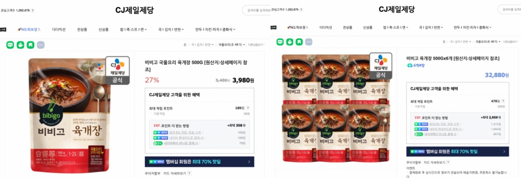 19일 관련업계에 따르면 CJ제일제당은 네이버 쇼핑 '브랜드스토어'에서 비비고 육개장 500g을 1개를 3980원에 판매하는 반면 6개짜리 묶음 상품은 3만2880원에 판매하고 있다.