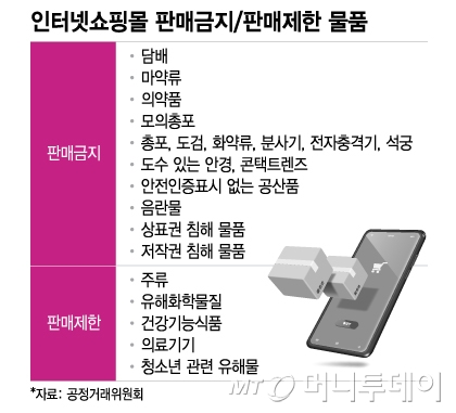 △담배 △마약류 △의약품 △모의총포 △총검, 도검, 화약류, 분사기, 전자충격기, 석궁 △도수 있는 안경, 콘텍트렌즈 △안전인증표시 없는 전기용품 또는 공산품 △음란물 △상표권 침해물품 △저작권 침해물품 △주류 △유해화학물질 △건강기능식품 △의료기기 △청소년유해물 등이다.