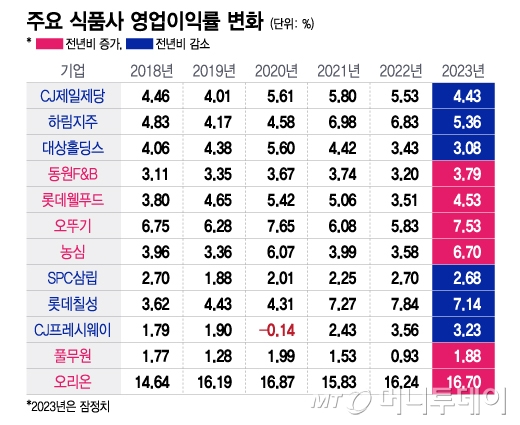 영업이익률은 영업이익을 매출액으로 나눈 비율로, 숫자가 높을수록 제품당 이윤을 많이 남겼다는 의미다. 예컨대 영업이익률이 5%인 기업은 100원짜리 물건을 팔아 5원을 남기는 식이다. 한국은행이 발표한 2022년 연간 기업경영분석에 따르면 식료품업종의 평균 영업이익률은 3.1%로 제조업 평균 5.7%에 못미친다.