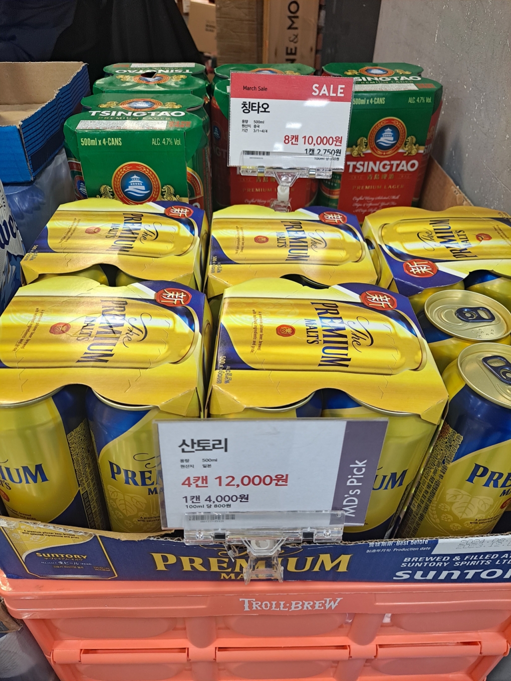 12일 유통업계에 따르면 신세계L&B가 운영하는 주류매장 '와인앤모어'는 칭따오 500ml 8캔 묶음상품을 1만원에 판매한다. 다음달 4일까지 기간한정 판매 제품이다. 낱개 구매시 판매가격은 2750원이지만 묶음상품으로 구매하면 개당 판매가격은 1250원 꼴이다. 칭따오의 판매가격은 다른 수입맥주와 비교할 때 반값에도 못미친다. 와인앤모어에선 산토리, 타이거, 에델바이스 등 500ml 4캔 제품을 1만2000원에 판매한다. 개당 3000원 꼴이다.