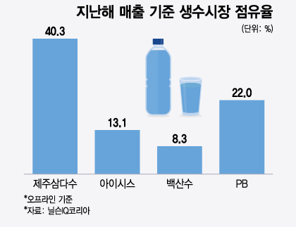 21일 제주개발공사에 따르면 닐슨IQ코리아가 집계한 지난해 오프라인 생수 소매시장 점유율은 제주삼다수가 40.3%로 2위 롯데칠성음료 아이시스 13.1%를 큰 격차로 앞섰다. 3위는 농심 백산수로 8.3%다.