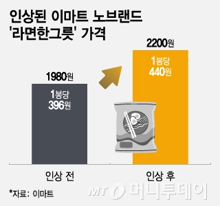 1일 이마트에 따르면 노브랜드는 지난 1월 자체브랜드(PB)상품인 '라면한그릇'(5개입)의 가격을 1980원에서 2200원으로 올렸다. 라면 1봉지당 가격은 396원에서 440원으로 오른 셈이다.