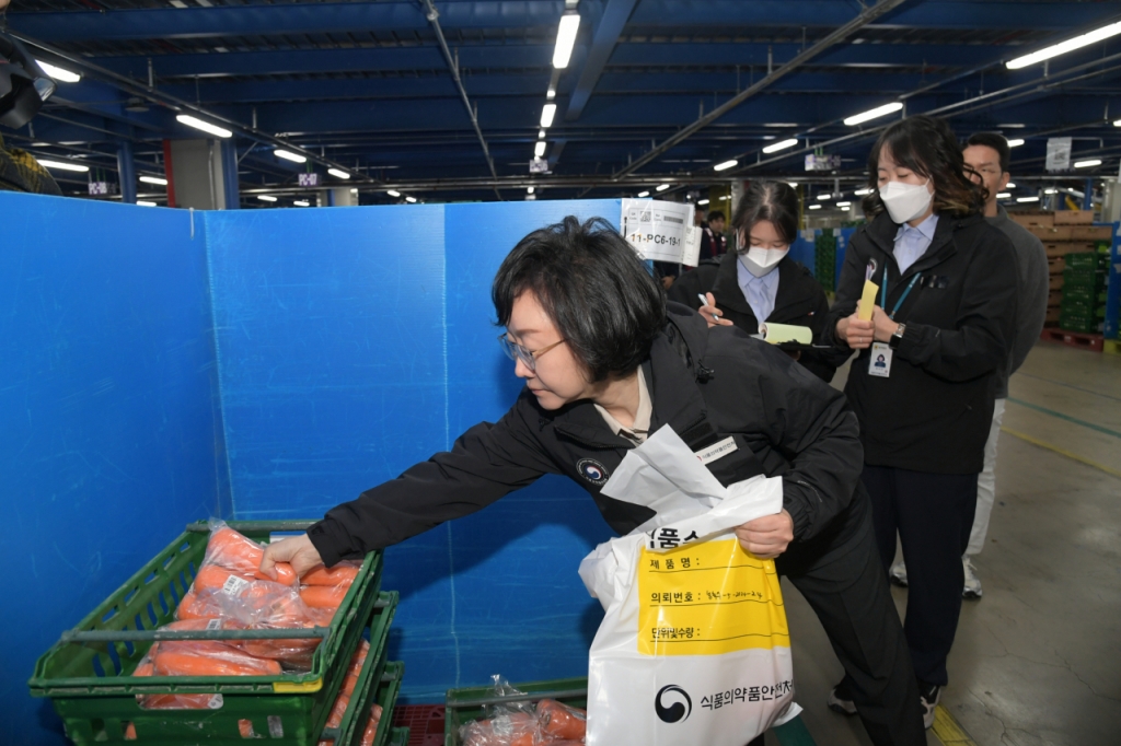 3일 오전 8시 경기도 김포시 컬리 물류센터. 농산물 검체 채취 작업에 직접 참여한 오유경 식품의약품안전처장은 장을 보듯 쌓여있는 농산물 중 하나를 골라 전용 봉투에 담았다. 이날 오 처장이 직접 물류센터에서 골라 신속 검사센터로 보내진 검체 품목은 당근, 상추, 청경채. 이날 해당 품목이 잔류 농약 검사를 통과할 경우 다음날 바로 고객들에게 집 앞으로 새벽 배송될 수 있다.
