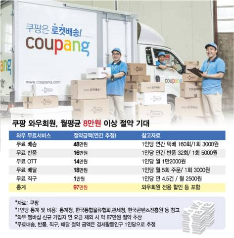 쿠팡은 이번 멤버십 인상분을 고려해도 1건당 3000원인 로켓배송 무료 혜택 등을 고려할 때 경쟁사 멤버십보다 여전히 가성비가 좋다는 입장이다. 쿠팡이 와우 회원 1인당 연간 평균 서비스 이용 횟수(연간 택배 160회, 반품 32회, 직구 4.5회)를 토대로 추정한 결과 멤버십 비용을 제외하고 연평균 87만원을 아낀 것으로 집계됐다.