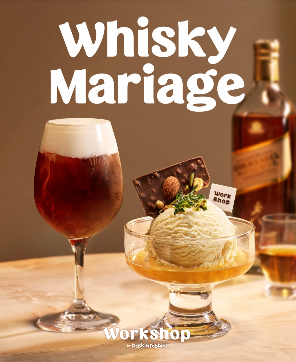 워크샵에서 처음으로 선보이는 '위스키 마리아주'는 배스킨라빈스 아이스크림과 커피에 조니어커 위스키를 더한 제품이다. 대표 메뉴는 위스키에 에스프레소, 설탕, 생크림을 올린 '위스키 아이리쉬 커피'다. 배스킨라빈스 대표 원두의 카카오향과 조니워커 골드 레이블 리저브의 과일 향, 벌꿀 향이 만났다.