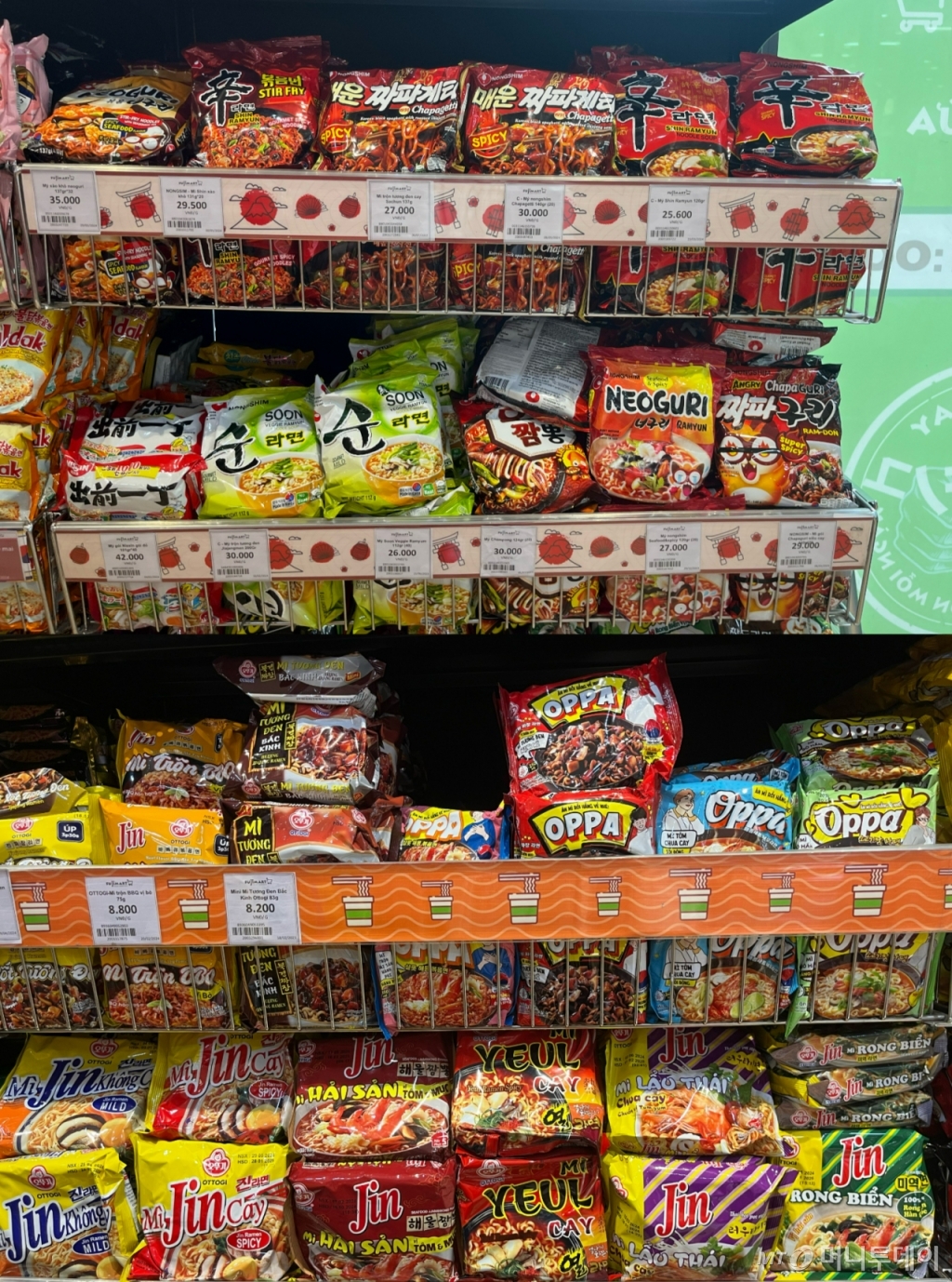 지난 10일 오후 방문한 베트남 수도 하노이 호안끼엠구의 후지마트. 마트의 가장 오른쪽 구역인 라면 코너에서 한국어로 오뚜기가 적힌 티셔츠를 입은 마트 직원이 진라면을 매대에 진열했다. 봉지 라면 코너에 있는 매대 10개 중 3개가 짜파게티, 불닭볶음면, 열라면, 팔도라면 등으로 채워진 모습이었다. 신라면 2봉지와 대상의 김치 양념을 바구니에 넣는 손님도 눈에 띄었다.