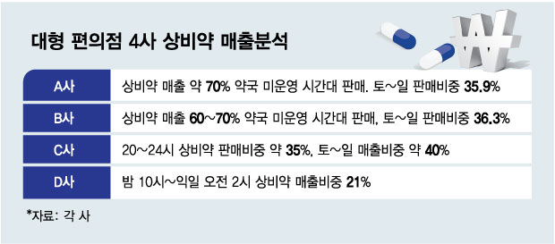 7일 머니투데이가 국내 4개 대형 편의점(CU, GS25, 세븐일레븐, 이마트24)의 올해 상반기 상비약 판매 매출 데이터 분석을 의뢰한 결과 약국이 운영되지 않는 야간 시간대와 주말 판매 비중이 높았다.