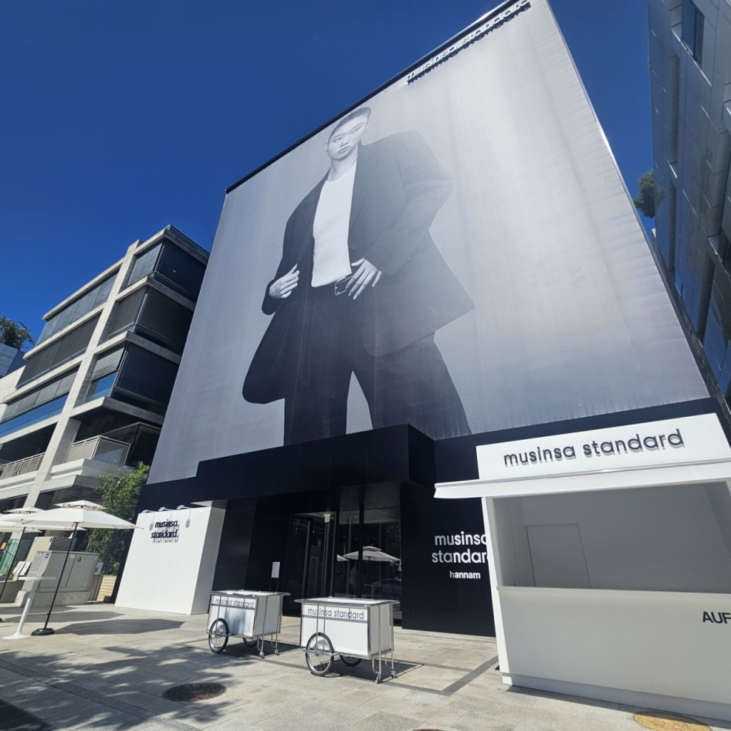 29일 오전 서울지하철2호선 한강진역 1번출구에서 내려 조금 걷다보니 란스미어, 꼼데가르송, 띠어리 등 국내외 패션 브랜드의 편집숍 매장이 펼쳐졌다. 쇼핑 명소로 자리잡은 한남동 일대 거리를 조금 걷다보니 지하1층부터 지상 5층까지, 총 6개층 규모의 무신사 스탠다드 한남점이 눈에 들어왔다. 전체 외관을 뒤덮는 대형 광고 판넬이 그 규모를 가늠케 했다. 이곳은 무신사 스탠다드의 서울 내 다섯번째 매장으로 영업 면적 기준으로는 1519.84㎡(약 460평)에 달해 가장 큰 규모를 자랑한다.