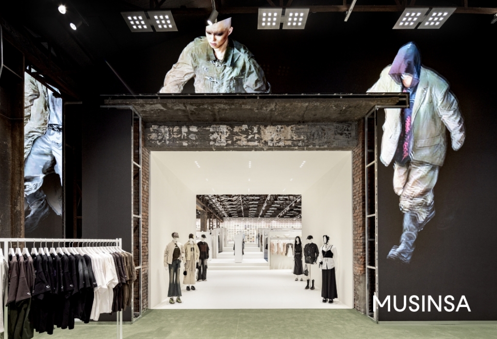 12일 오전 '무신사 스토어 성수@대림창고'에 들어서자 화려한 브랜드 영상이 재생되는 미디어월이 눈길을 사로 잡았다. 1970년 정미소로 지어진 이곳은 창고, 복합문화공간을 거쳐 무신사의 새로운 쇼핑 공간으로 재탄생했다. 대림창고의 시그니처인 박공 지붕을 그대로 살렸으며 높은 천정고와 계단식 구조를 강조해 산책하듯 거닐수 있게 조성됐다.
