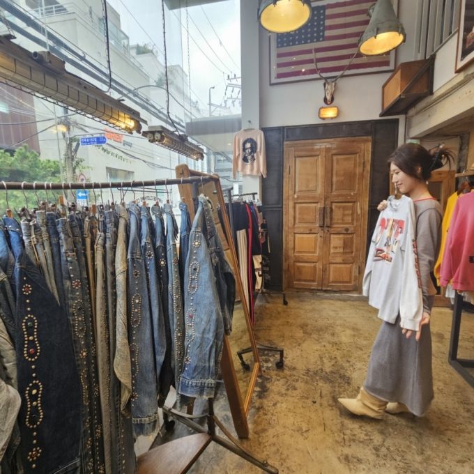 지난 18일 오전 샤넬·구찌 등 명품 매장이 들어선 압구정로데오역 인근에 외관부터 고급 패션 편집숍을 연상케하는 구제의류 매장이 들어서 있다. 이곳은 아메리칸 빈티지를 콘셉트로 1980~1990년대 유행했던 미국산 구제 의류들을 들여와 선보이는 편집숍이다.