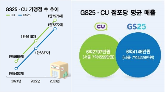 전국 가맹점 수는 CU가 1만7576개로 1만7272개인 GS25보다 304곳 많다. 다만 서울 시내 가맹점 수는 GS25가 3117개로 2807개인 CU보다 여전히 많다. 경기 지역 가맹점 수는 GS25가 4776개로 CU(4756개)보다 20곳 많다.